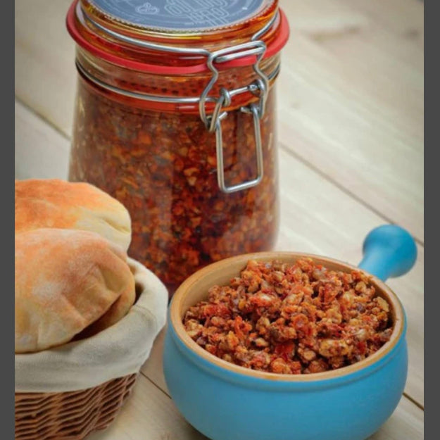 Makdous features petite eggplants meticulously stuffed with locally-crafted chili paste and walnuts, then preserved in olive oil to develop a distinctive pickled character. The fermentation process imparts a bright, tangy complexity that cuts through the richness of the nuts while the chili provides measured warmth. This layered flavor profile—combining pickle-forward acidity with savory depth—makes it exceptionally versatile: serve as a bold appetizer, layer into sandwiches, or use as a condiment alongside grilled proteins and fresh vegetables for an authentic taste of regional tradition.